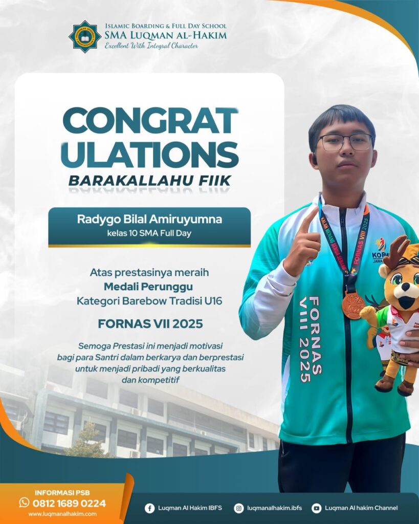 Salah satu santri terbaik SMA Luqman Al-Hakim, Radygo Bilal Amiruyumna, berhasil menorehkan prestasi membanggakan di ajang bergengsi Festival Olahraga Rekreasi Nasional (FORNAS) VII tahun 2025. Santri kelas 10 SMA Full Day ini meraih medali perunggu dalam kategori Barebow Tradisi U16, sebuah cabang olahraga panahan tradisional yang menguji fokus, teknik, dan ketahanan mental.
